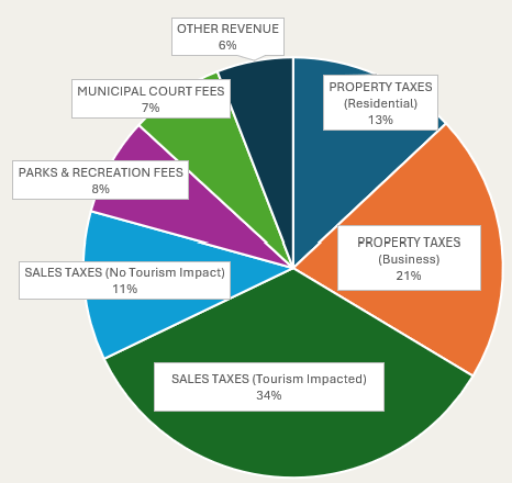 The Sales Tax was detailed into two separate categories. The No Tourism Impact are the sales tax from goods and services purchased that are directly attributable to residents and businesses inside city limits. The Tourism Impacted are sales tax that can be increased by people of the broader community – things like restaurants, retail shops, auto services, and other hospitality items.